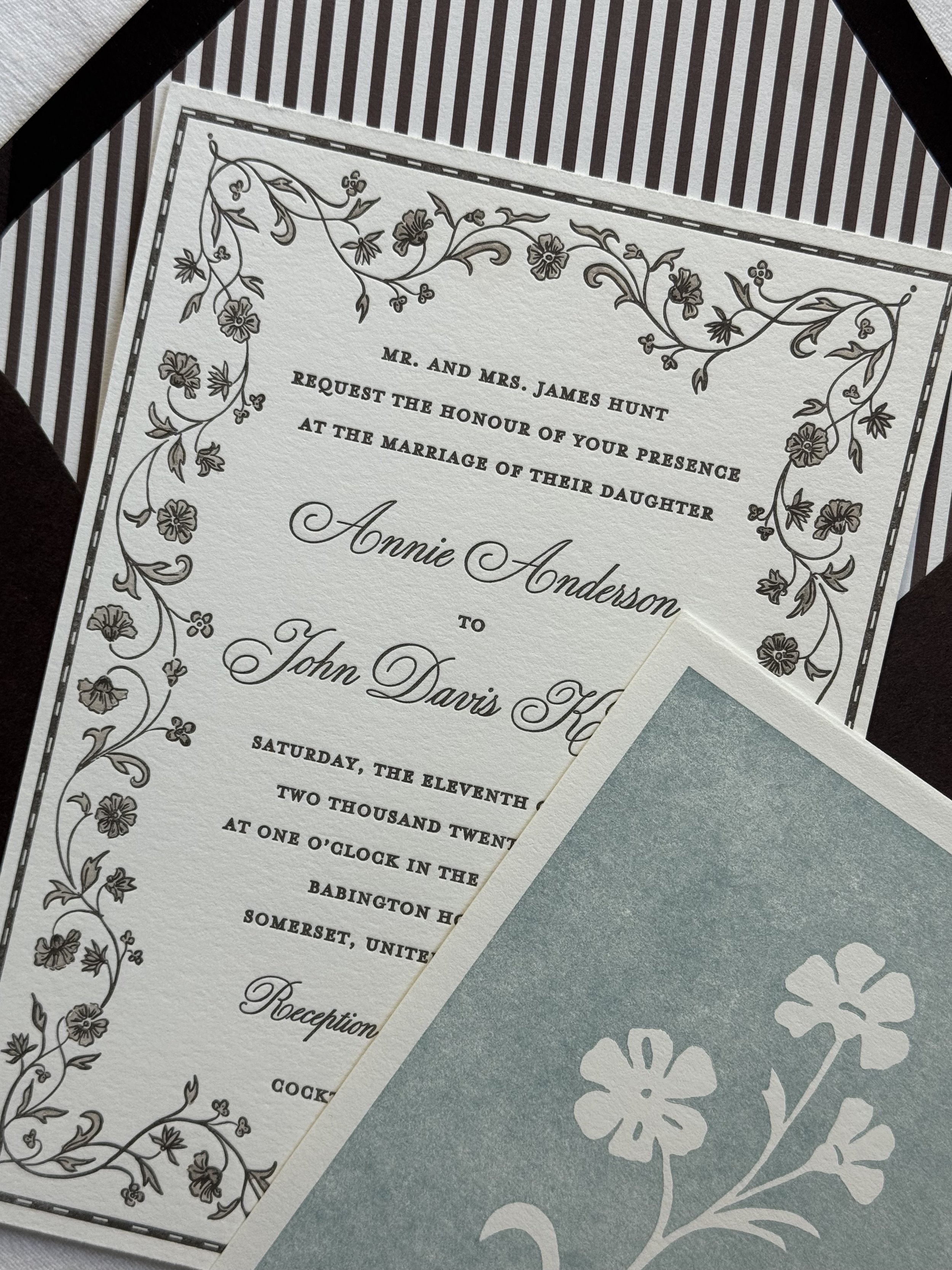 Custom wedding invitation suites begin at $2,200. Final pricing varies based on print method, paper selection, and finishing details.