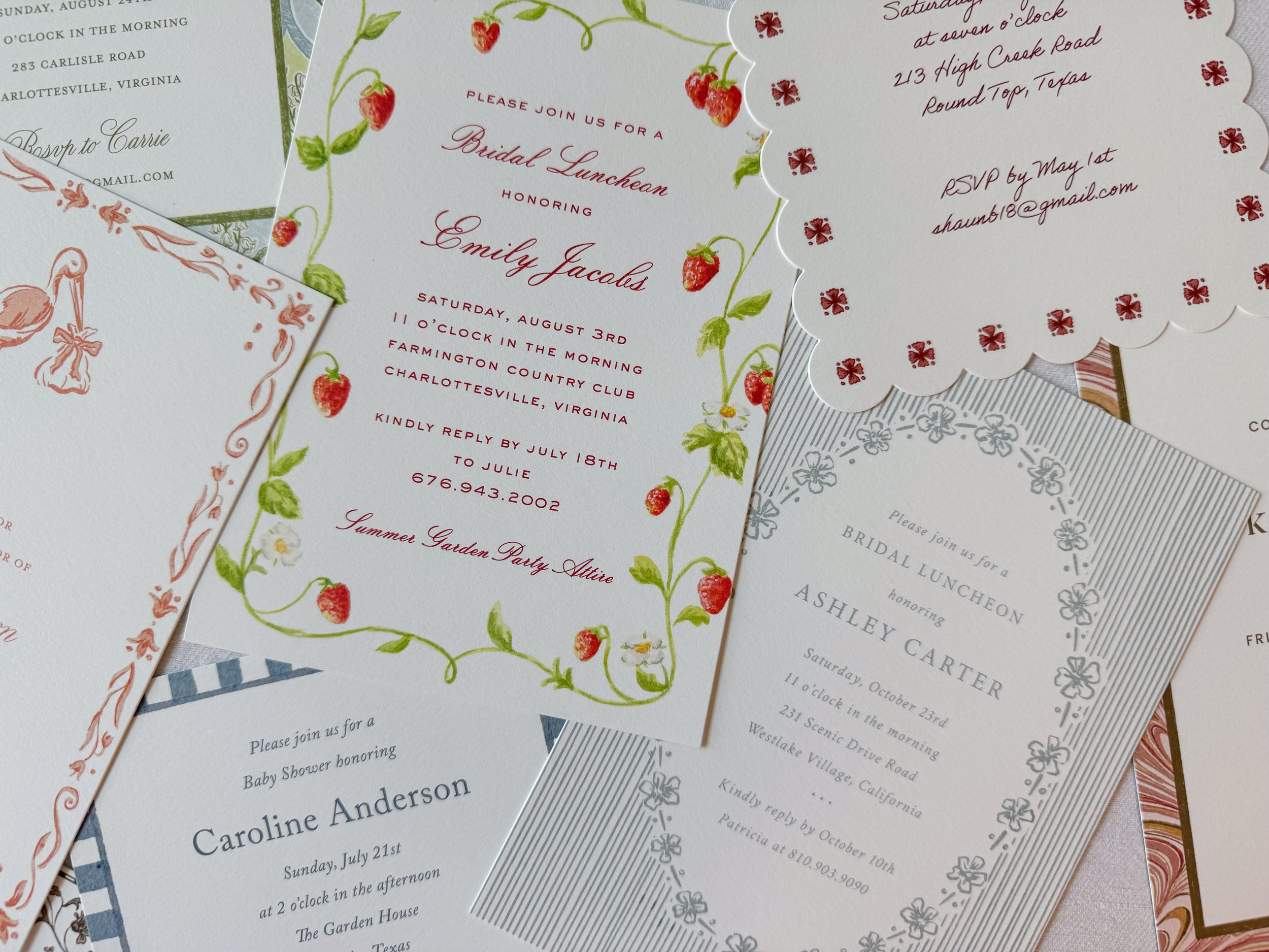 In addition to weddings, I also design invitations for baby showers, bridal showers, and other meaningful gatherings. Because these projects are typically smaller in scope, pricing for custom shower invitations is tailored accordingly.